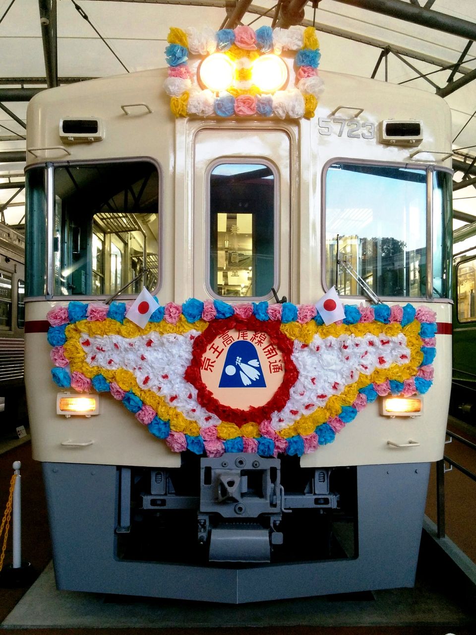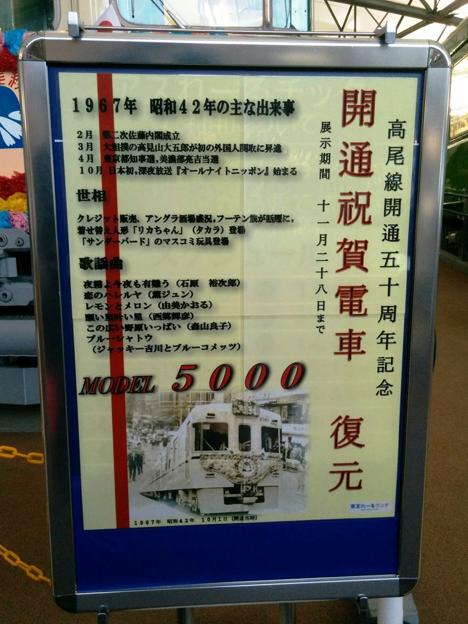 京王れーるランドでは時々、沿線イベント(急行・特急高尾山冬そば号運行など)にあわせて保存車両のヘッドマーク再現を実施しています。写真は高尾線開通50周年の際に再現された開通祝賀電車のヘッドマークとその看板です。