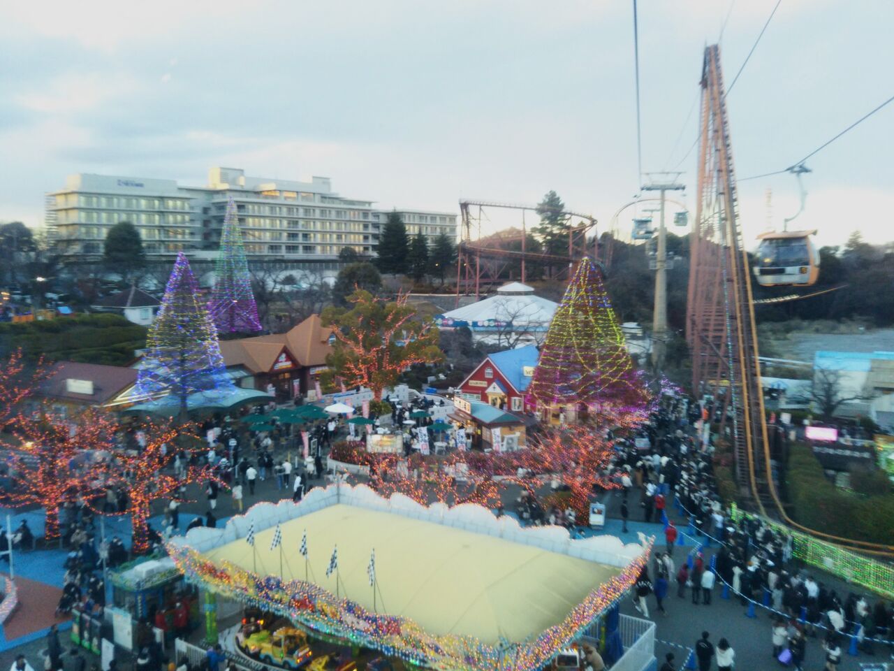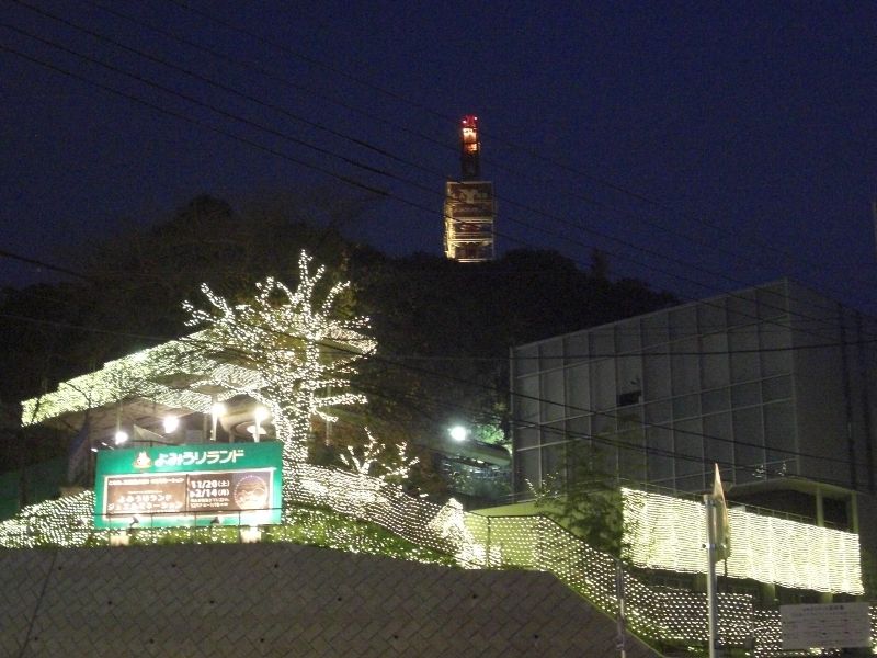 毎年、冬季の夜間営業で実施されるイベント『ジュエルミネーション』。施設、遊具に電飾を取り付けられており、ゴンドラも搬器の一部もその対象となっています(室内に電飾を取り付けるため回送扱い)。このイベントの協賛は川崎市、稲城市、小田急電鉄、京王電鉄。
