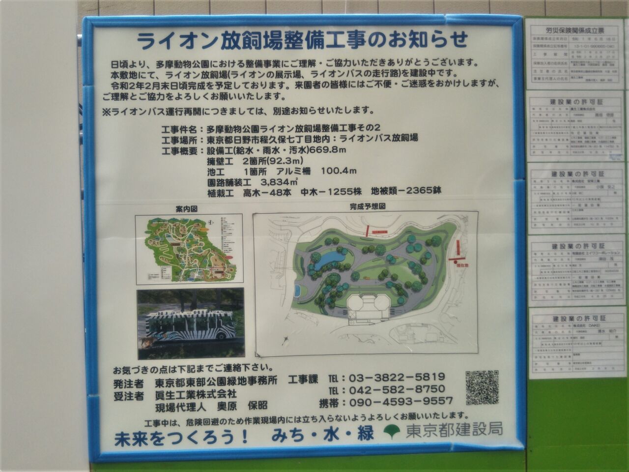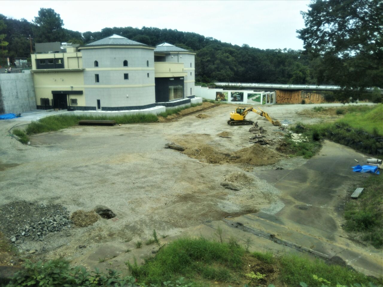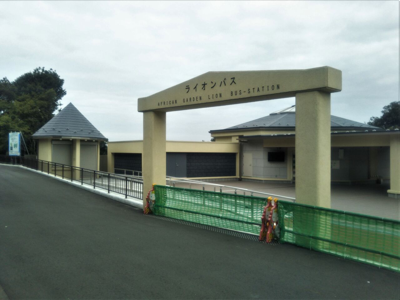 休止期間中のアフリカ園・ライオンバス周辺の様子。ライオン放飼場は仮のわずかなスペース。ライオンバスステーション(ライオンバス乗り場)の建物自体は既に出来上がっているように見えますが、ライオンバスの走行路は未整備の状態。