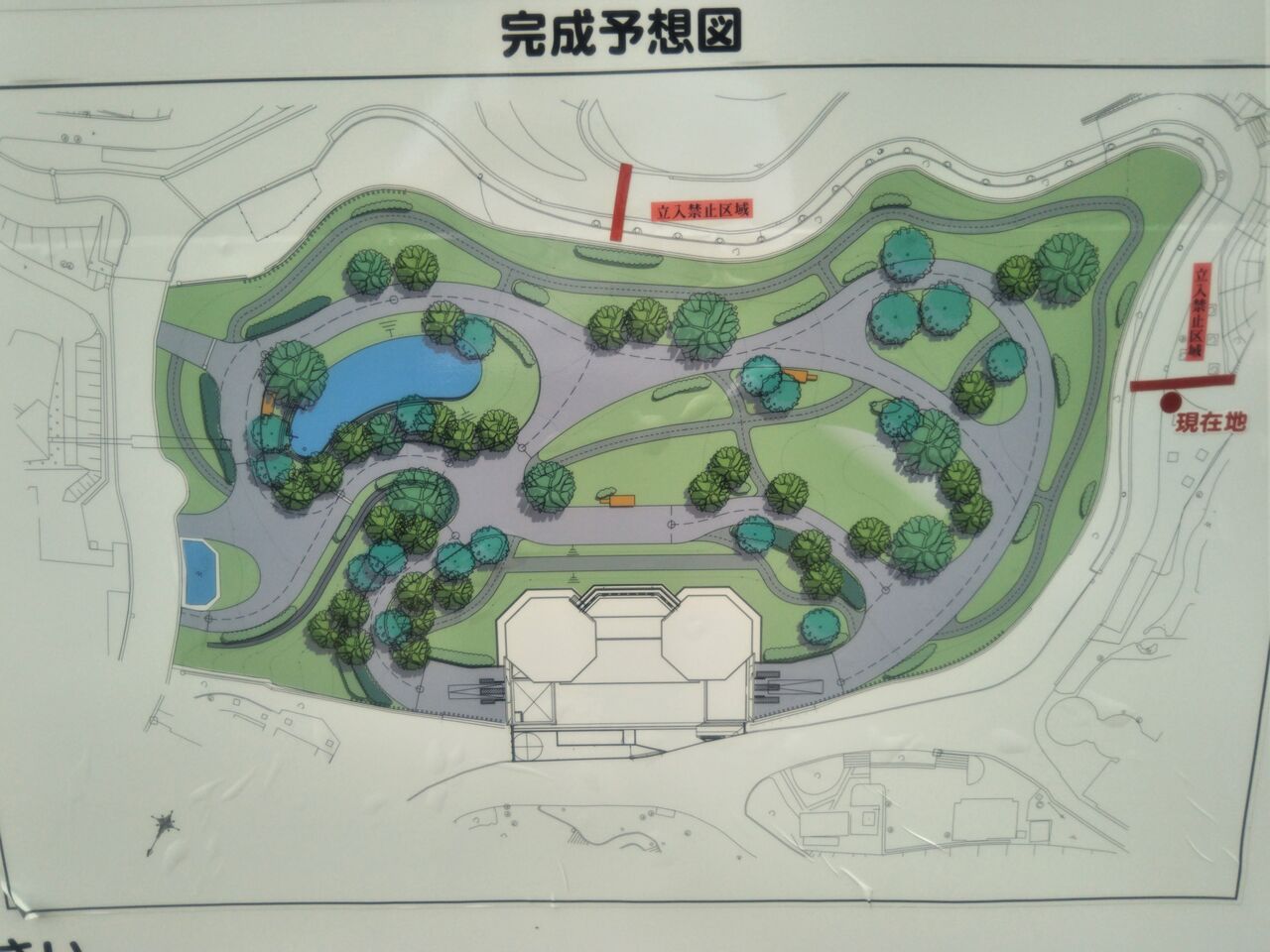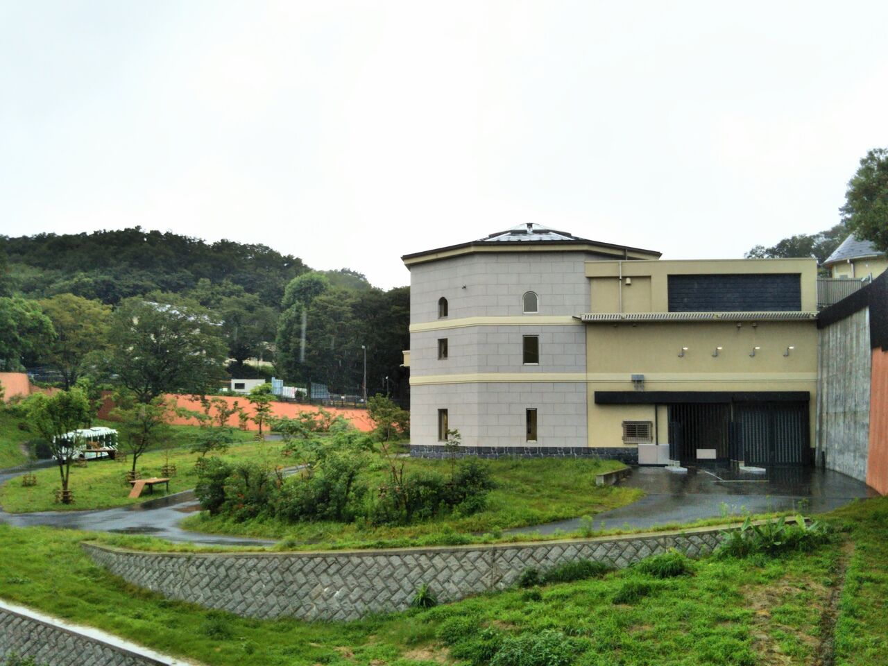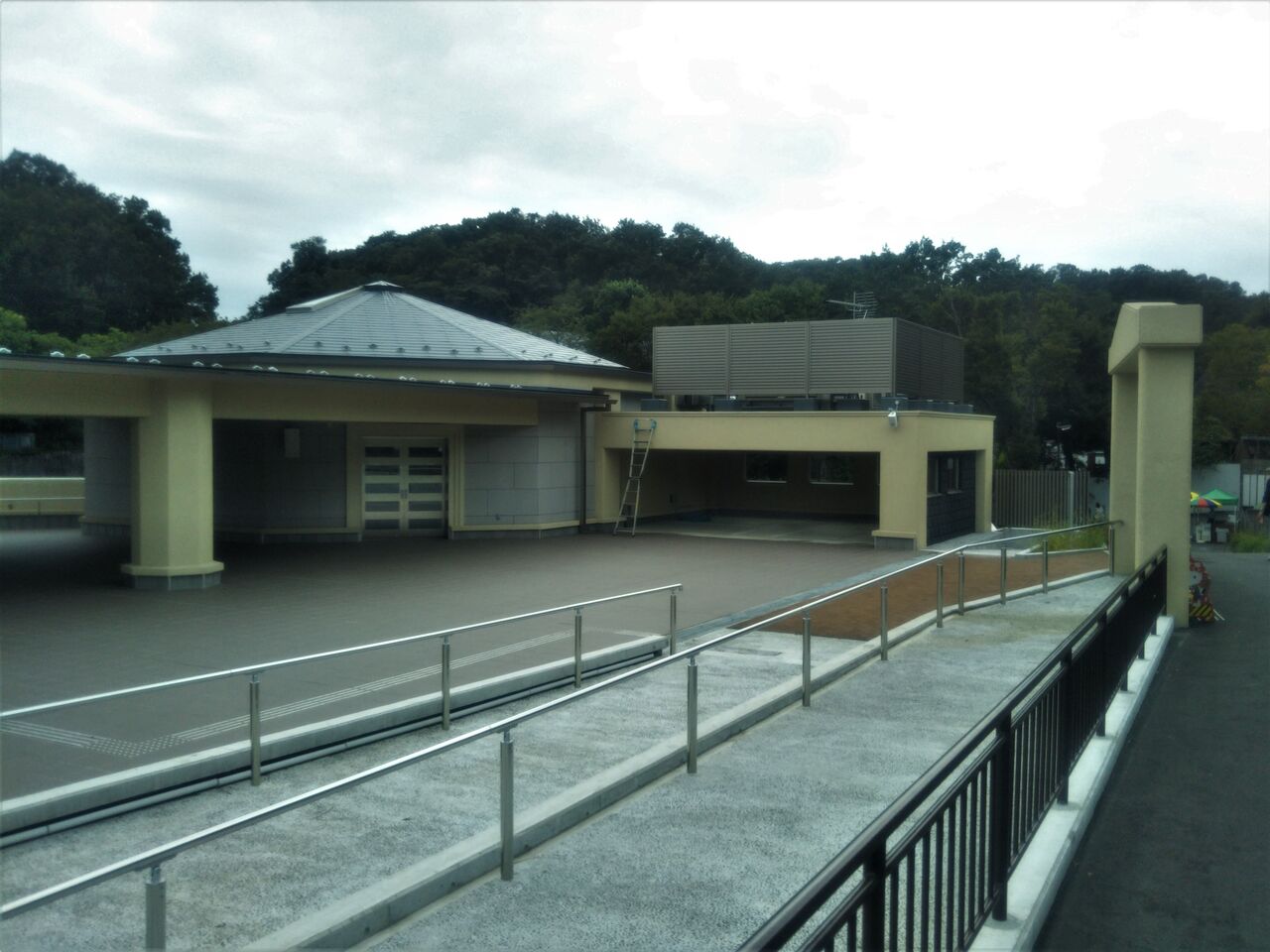 休止期間中のアフリカ園・ライオンバス周辺の様子。ライオン放飼場は仮のわずかなスペース。ライオンバスステーション(ライオンバス乗り場)の建物自体は既に出来上がっているように見えますが、ライオンバスの走行路は未整備の状態。