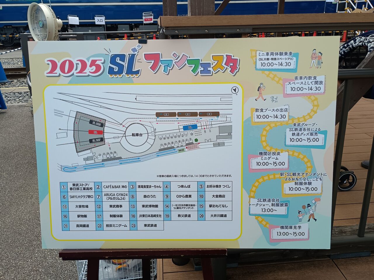 写真左は会場案内図です。写真右は会場に入ってすぐの客車内飲食スペースで、出入口にはステップが設置。1号車側が入口、3号車側が出口となっていました。