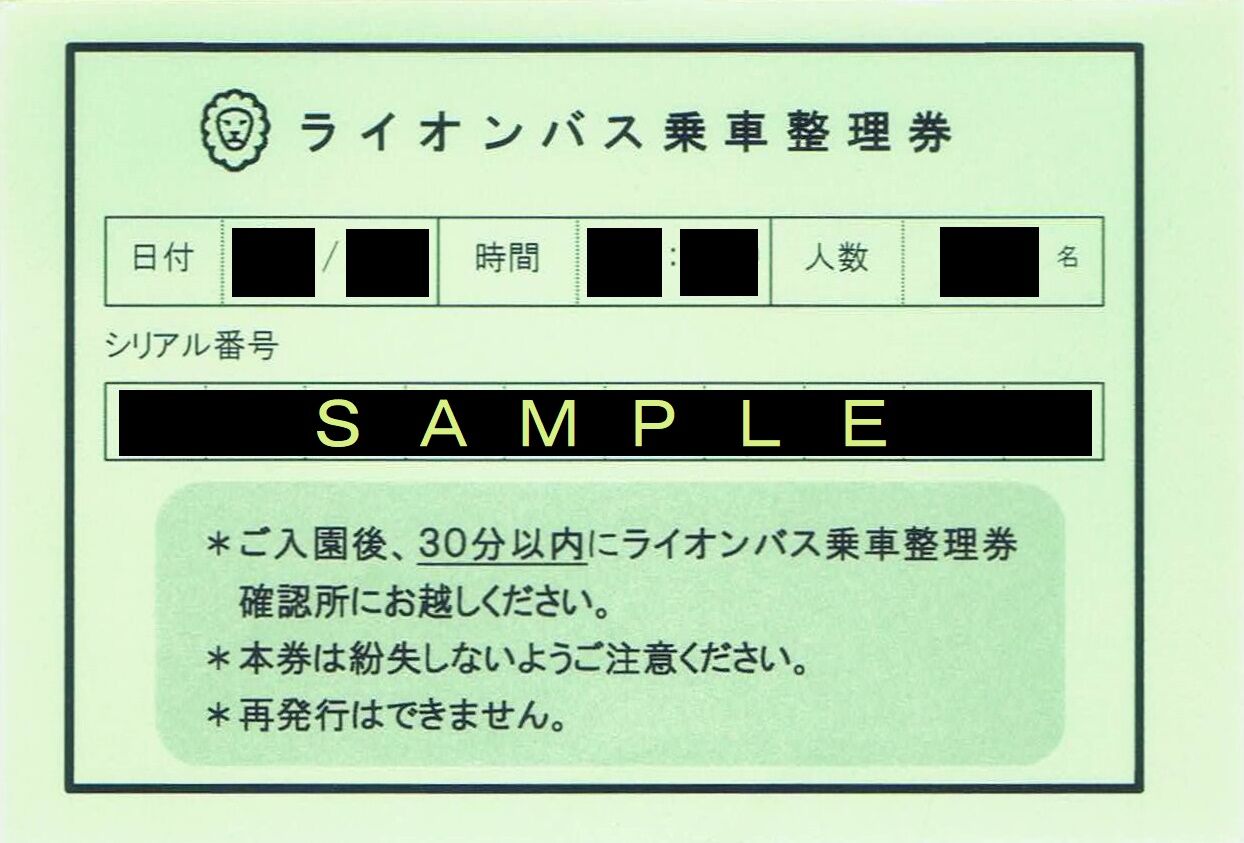 先述の『ライオンバス乗車整理券つき入園整理券』は予約完了後に整理券を表示させるためのURLを記載したメールが送られてきますが、私は間違えてそのメールを消去してしまいました。その様な場合に入園時、正門前の受付で発行されるライオンバス乗車用の整理券です。《ライオンバス乗車券(2024年3月)》