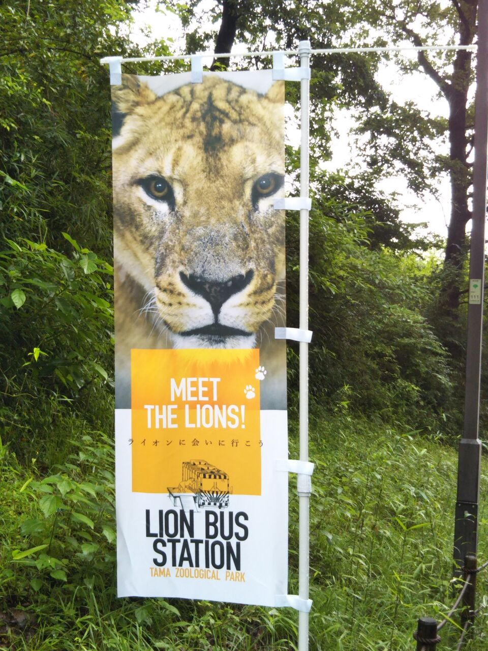 ライオンバス運行再開にあわせて掲出開始されたのぼり。〔ライオンバスステーション(ライオンバス乗り場)など〕