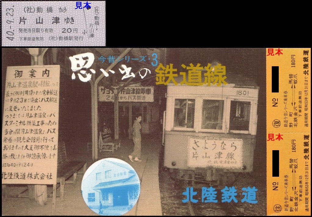 片山津線(昭和40年廃止)の現役時代の切符はありませんので、硬券復刻版と廃線後の片山津線図柄の記念切符のみ掲載します。