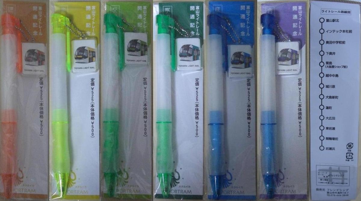 開業から1年経過した平成19年5月3日に購入した開業記念ボールペン。赤色が一番人気のようで既に売り切れていましたが、その他の6色は在庫がありました。発売元は富山駅北電停前のフレンドシップ。7色で縁起が良さそうだからか、オレンジは健康運、黄色は金運、黄緑色は交通安全、緑色は家内安全、青は成功運、パープルは合格運(購入していない赤色は不明)と台紙左上に記載されています。