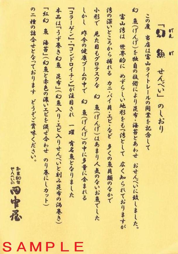 平成19年5月3日に購入した開業記念菓子。富山湾で採れる深海魚・幻魚を使用したせんべいです。当時は富山ライトレールの商品化許諾済による田中屋発売の商品だったと思われ、写真左の包装紙に包まれた箱の中にせんべいと写真右のしおりが入っていました。平成22年になってからは富山ライトレールの公式グッズに加わったようで『富山港発〜ポートラムせんべい〜』という商品名で電車型パッケージによる販売となっています(田中屋による一般販売の幻魚せんべいもあります)。中身の写真はどこかにやってしまいましたが、富山ライトレール公式ホームページ内にあるポートラムせんべいと同一の渦巻きの形状であった事は覚えています。
