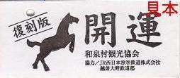表面に複製の文字は無し。裏に「復刻版(馬のイラスト)開運 和泉村観光協会 協力/JR西日本旅客鉄道株式会社越前大野鉄道部」と書いてあります。券番はありません。こちらの商品は村おこしの一環として作られたようでアイデア自体とても面白く(実際にストラップとしてつけると硬券を折り曲げてしまいそうですが)、バスは無くなってしまったけれど地元の方の郷土愛が感じられる土産物です。しかも通販不可の商品なので確実に来村しなければならないので(車でも行けそうですが)越美北線の活性化につながります。営利目的の度合いが強くて現役時代の切符と似ていない(鉄道に対する愛情が感じられない)某駅跡前売店の複製品とは訳が違います。但し切符を取り出すにはケースを切らなくてはなりません。そのために2つ購入しましたが結局、ひとつはケースを切って残った部分のみストラップにしました。