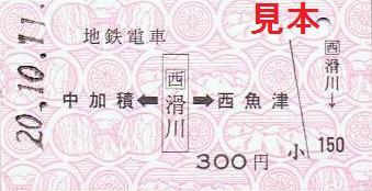 京阪電気鉄道の旧3000系特急車ラストランを記念して富山地方鉄道が発売したD型フリー乗車券の小児用です。※2008年10月13日掲載(滑川駅硬券乗車券)