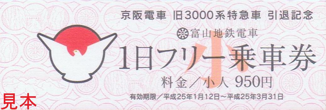 《京阪電車旧3000系特急車引退記念富山地鉄電車1日フリー乗車券・小児(平成25年)》