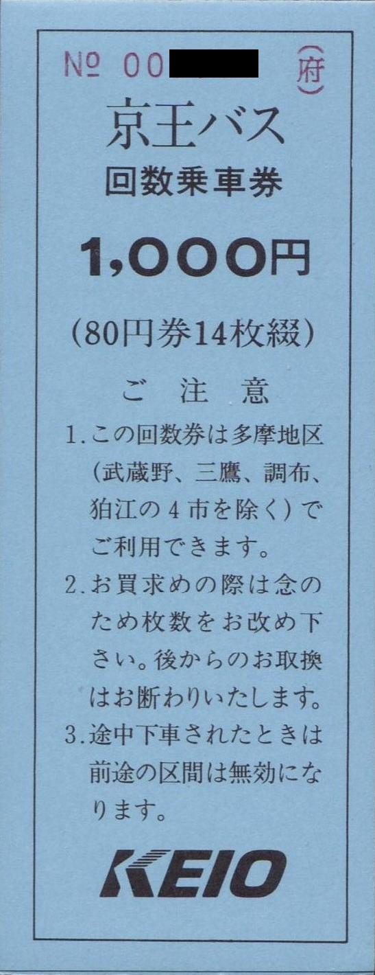 京王電鉄バス小金井案内所で尋ねたところ最安の乗車券として出てきたのが、売価1000円で80円券×14枚綴の回数乗車券。京王電鉄バスグループのホームページでは『多摩地区回数券』という名称で案内されています。現在、一部路線が分社化されていますが、様式に変化があったかは分かりません。