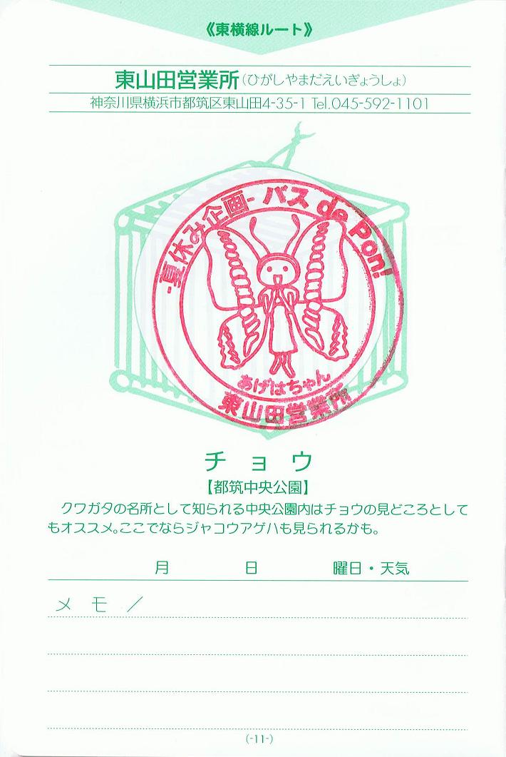 東急バス東山田営業所等を廻るスタンプラリー『バス de Pon!』が開催されました。ラリーの経由地に実際に生息している昆虫を可愛いキャラクターにして、それらのスタンプを集めるといった内容でした。東山田営業所以外には武蔵小杉案内所、虹が丘営業所、電車とバスの博物館がスタンプ設置箇所となっていました。