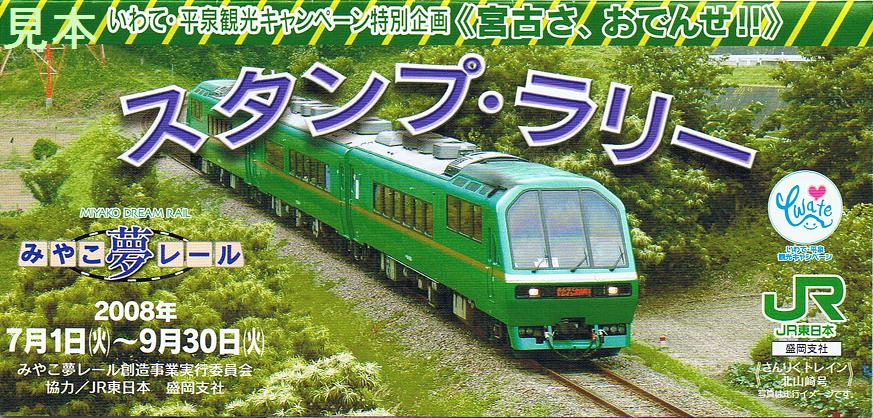 平成20年7月1日〜9月30日に実施。宮古市内のスタンプラリー協力店を廻り、抽選に応募できるという内容です。写真はスタンプラリー応募用紙で、さんりくトレイン北山崎号の写真が使用されています。駅としてはJR・三陸鉄道宮古駅がラリーに参加しており、応募用紙もJR宮古駅で貰えました。