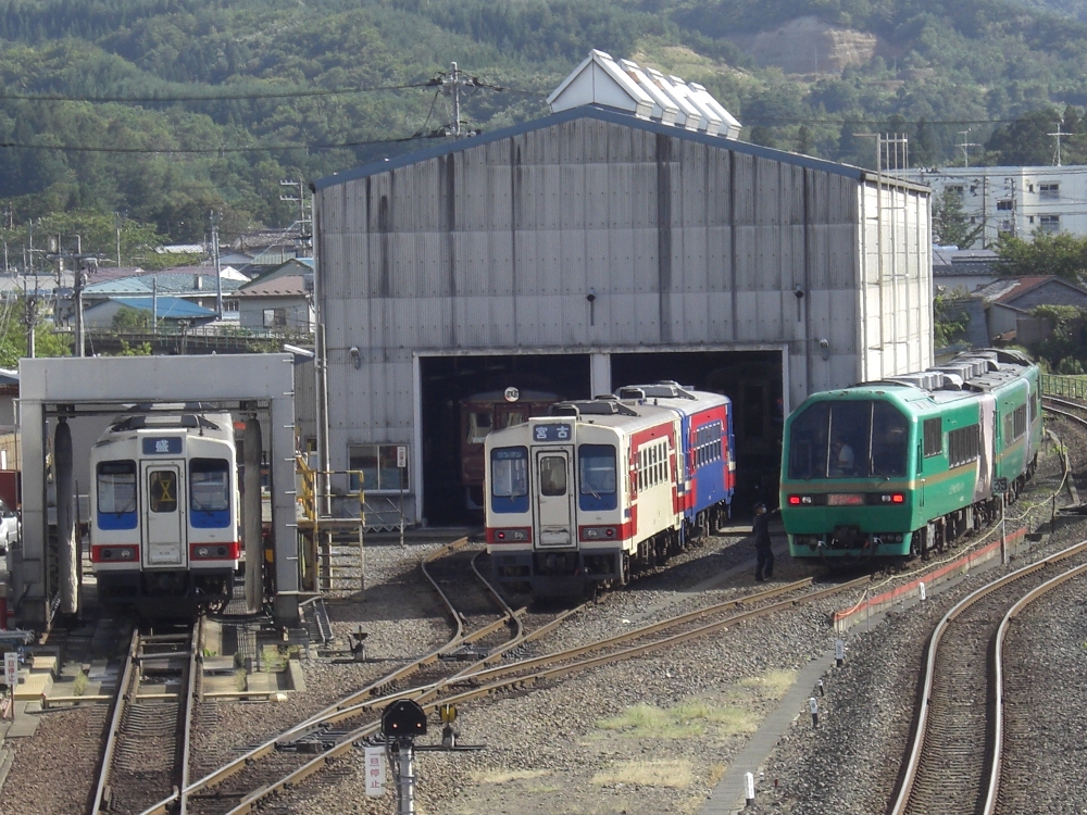写真は2点とも平成21年9月20日に久慈駅で撮影。同駅に着いたキハ58系kenjiは、折り返しの盛岡行となるまで留置線に入線するようです。
