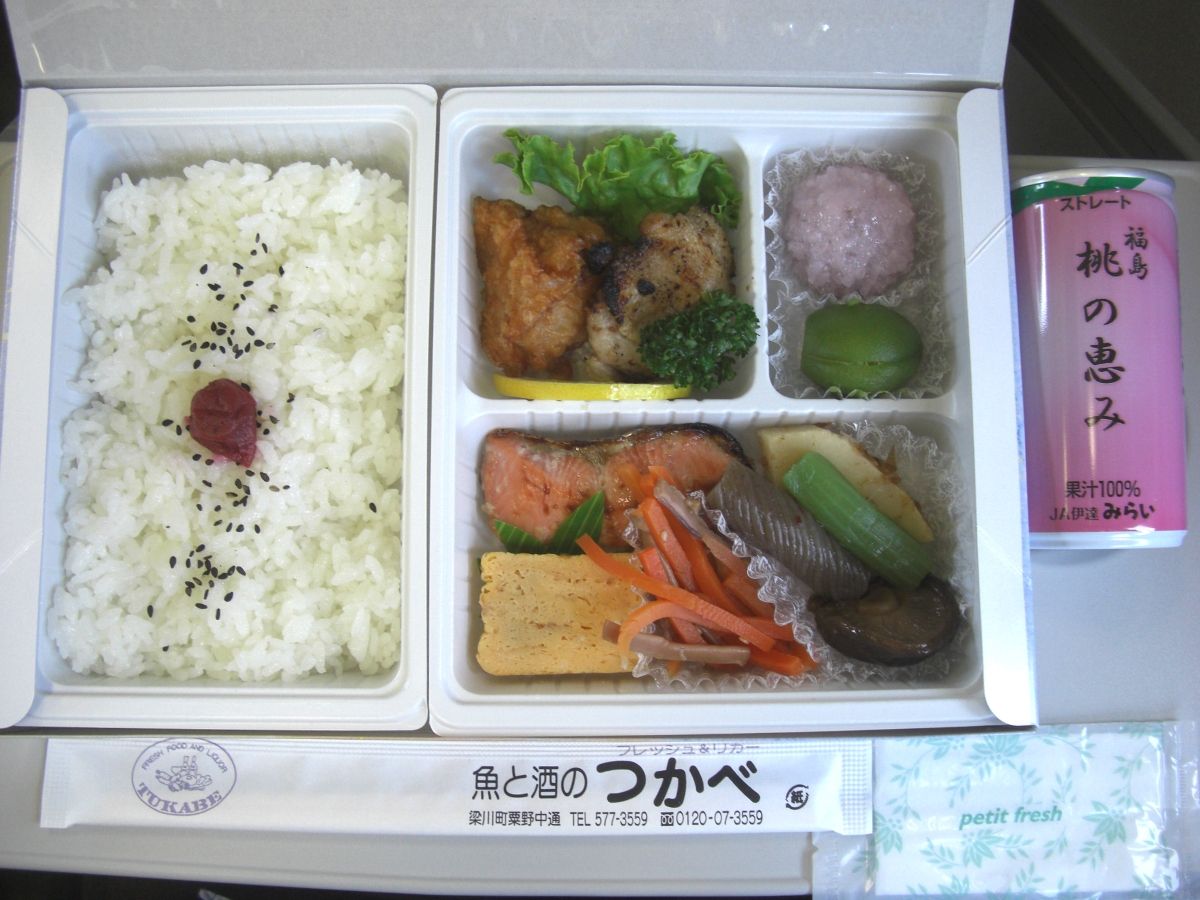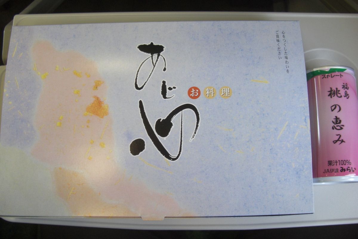 弁当と一緒に写っている桃ジュースは伊達市の引換券サービスで先述のジャンボどら焼と一緒に配布されたJA伊達みらいの『福島桃の恵み』。