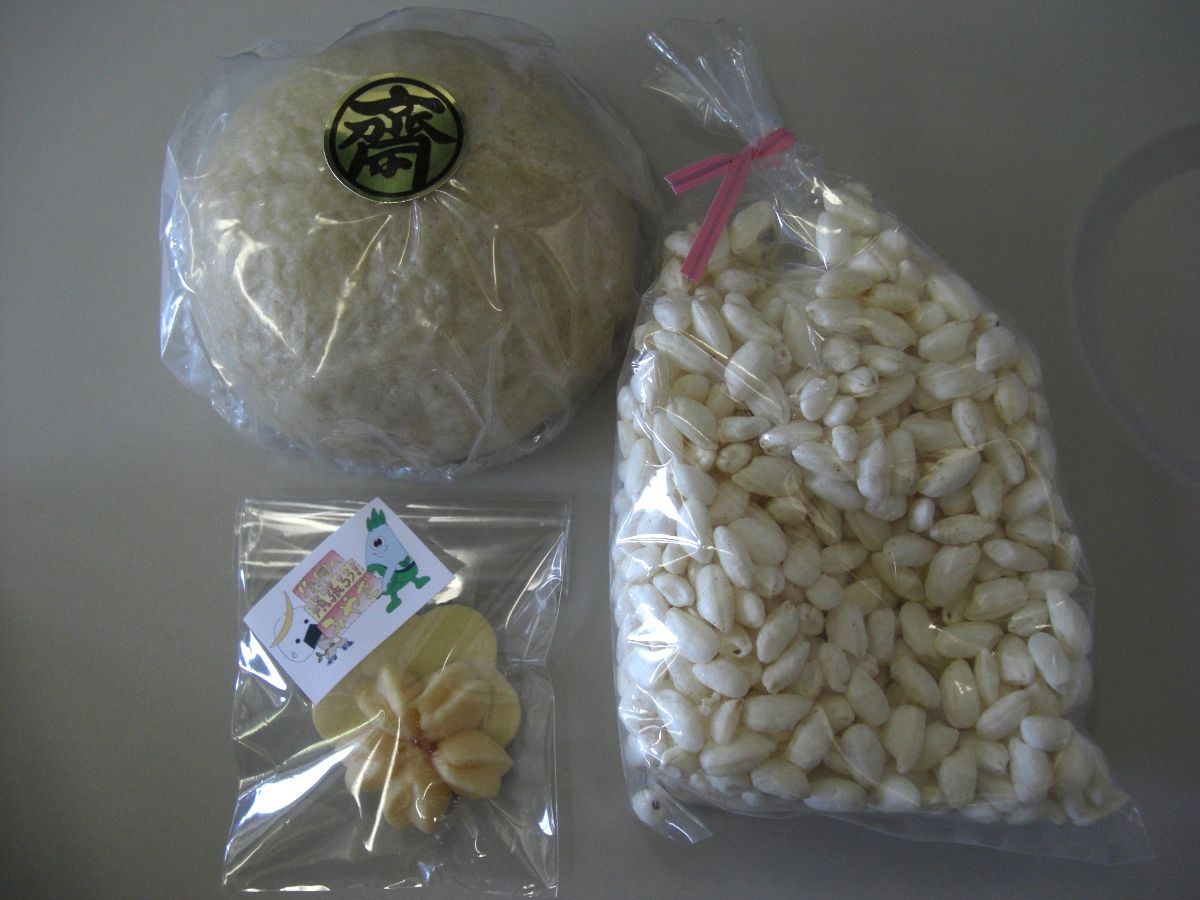 宮城県産米を使用したお米麺(白米、玄米)各1袋を写真左の列車名入りシールを貼ったビニール袋に入れて配布していました(写真右が配布時の状態)。〔丸森駅 お菓子セット〕