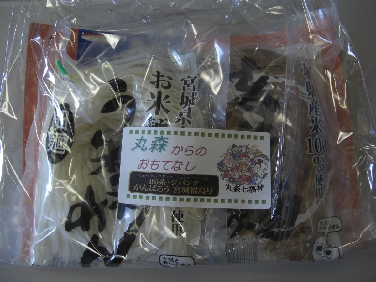 宮城県産米を使用したお米麺(白米、玄米)各1袋を写真左の列車名入りシールを貼ったビニール袋に入れて配布していました(写真右が配布時の状態)。