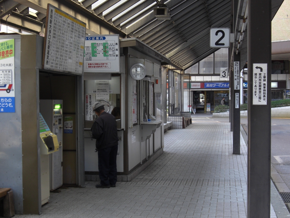 平成22年5月3日撮影。小千谷=片貝=来迎寺=長岡線の発着する大手口側のバスターミナル。JR長岡駅西口駅前にあります。バスターミナル内には越後交通の長岡駅前案内所(大手口)(写真)があり、回数券・定期券の発売を行っています。また、バス乗車券(1回限りの乗車分)については券売機で先述の様式のものが発売されます。