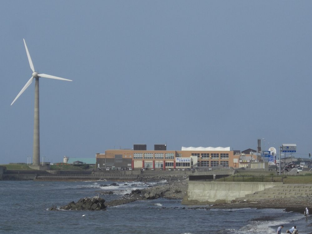 写真は国道8号沿いより撮影したもの。風力発電用の風車があります。