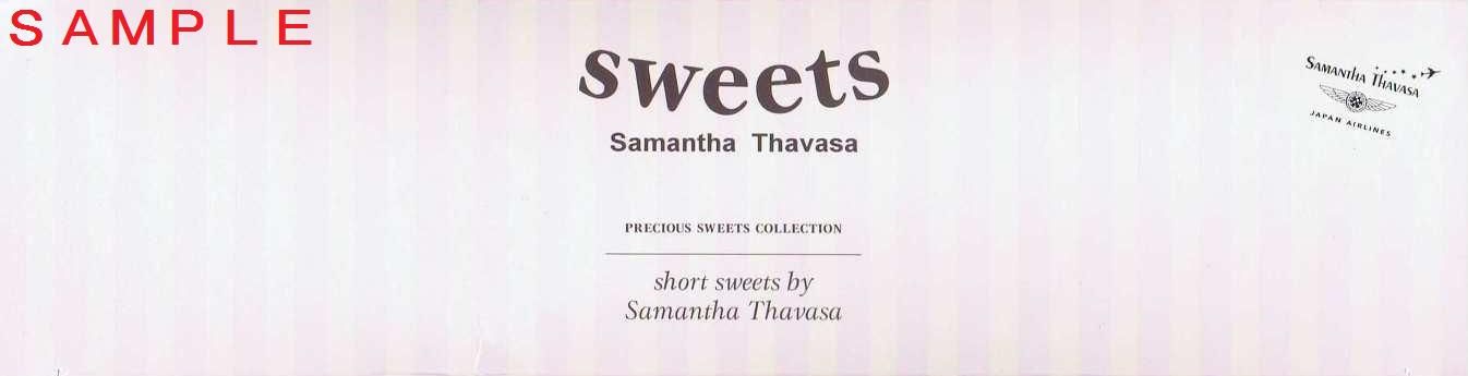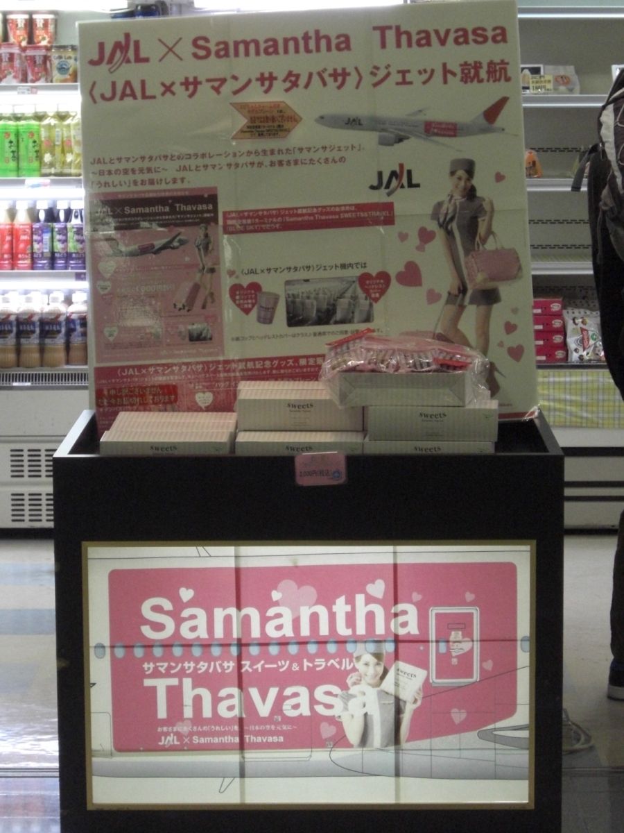 JALではバックやジュエリーの製造販売している株式会社サマンサタバサジャパンリミテッド(ブランド名:サマンサタバサ)とのコラボレーション企画として、平成23年2月8日~5月7日までの予定で羽田-福岡線、羽田-札幌線、羽田-伊丹線に『JAL×Samantha Thavasa ジェット』(公式ホームページ時刻表等では『サマンサジェット』とも表記されている)を就航させました。機材にはイメージモデルの蛯原友里さんがデザインされています。就航記念として羽田空港第1ターミナル内の『サマンサタバサ スイーツ&トラベル』(出発ゲート内)と『BLUE SKY』でオリジナルキャンバスバッグ、モデルプレーン、オリジナルスイーツ(後述)が販売されています。写真は平成23年2月12日に羽田空港第1ターミナルのBLUE SKY店頭のオリジナルスイーツコーナー。ポスターと合わせて機体側面のラッピングデザインで目立ちます。