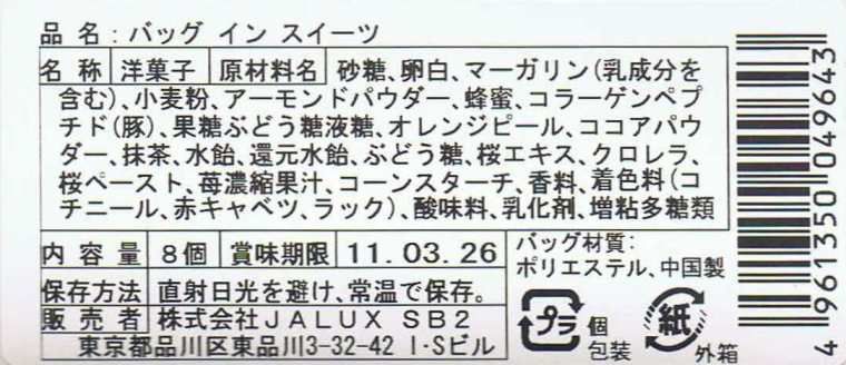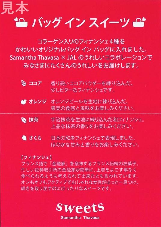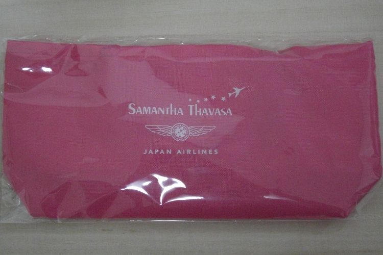 ミニバッグとコラーゲン入りのハート型フィナンシェがセットで、写真左のピンクと白のパッケージに入っています。販売者はBLUE SKYの運営等を行うJALUX。ミニバッグとパッケージには『SAMANTHA THAVASA』『JAPAN AIRLINES』コラボレーションのロゴ入り。数量限定で商品がなくなり次第販売終了です。