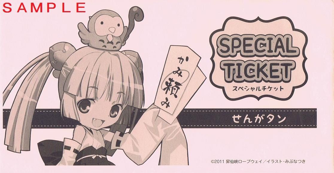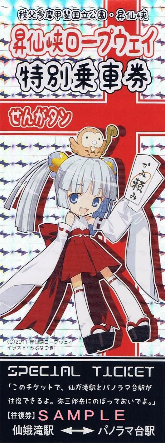 『オリジナルキャラクター導入』も再生計画のひとつとしてあげられています。既に同社の封筒には『福仙人』という梟のキャラクターが描かれていますが、平成23年6月には索道事業者としては珍しい少女キャラとして『せんがタン(仙娥えな)』を登場させました。事業者の公式HPによると『昇仙峡ロープウェイ山頂八雲神社の自称・巫女さん』という設定。デザインは多くの鉄道事業者でもグッズ化されている『鉄道むすめ』と同じみぶなつきですが、見た目はかなり『萌え系』が強くなっているように思えます。せんがタンの活用については同社ホームページで分かる範囲だけでも搬器へのラッピング、グッズ発売、キャラクターのデビューを記念した『せんがタン特別乗車券』(大人用往復券のみ1,000円)の発売があり、積極的なキャラクターの活用により本気で企業再生を果たそうと取り組んでいることがよく分かります。特に特別乗車券については通信販売用の特設サイトまで用意されています。