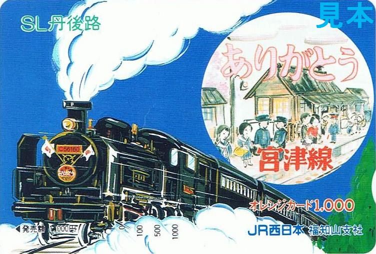 JR西日本としての宮津線廃止時に運行されたSL丹後路号のイラストを使用したオレンジカード。JR西日本福知山支社が発行。【関連記事】