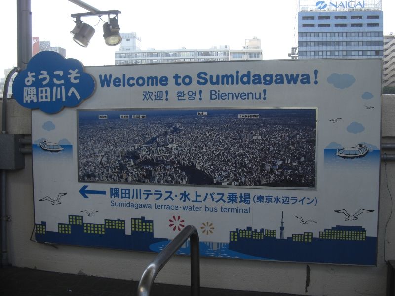 両国乗船場に設置されていた看板。『隅田川テラス水上バス乗場』ともいうようですが、両国の場合、JR両国駅からの利便性が良いので乗船場名は両国に統一した方が分かりやすいと思います。