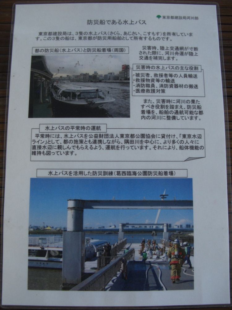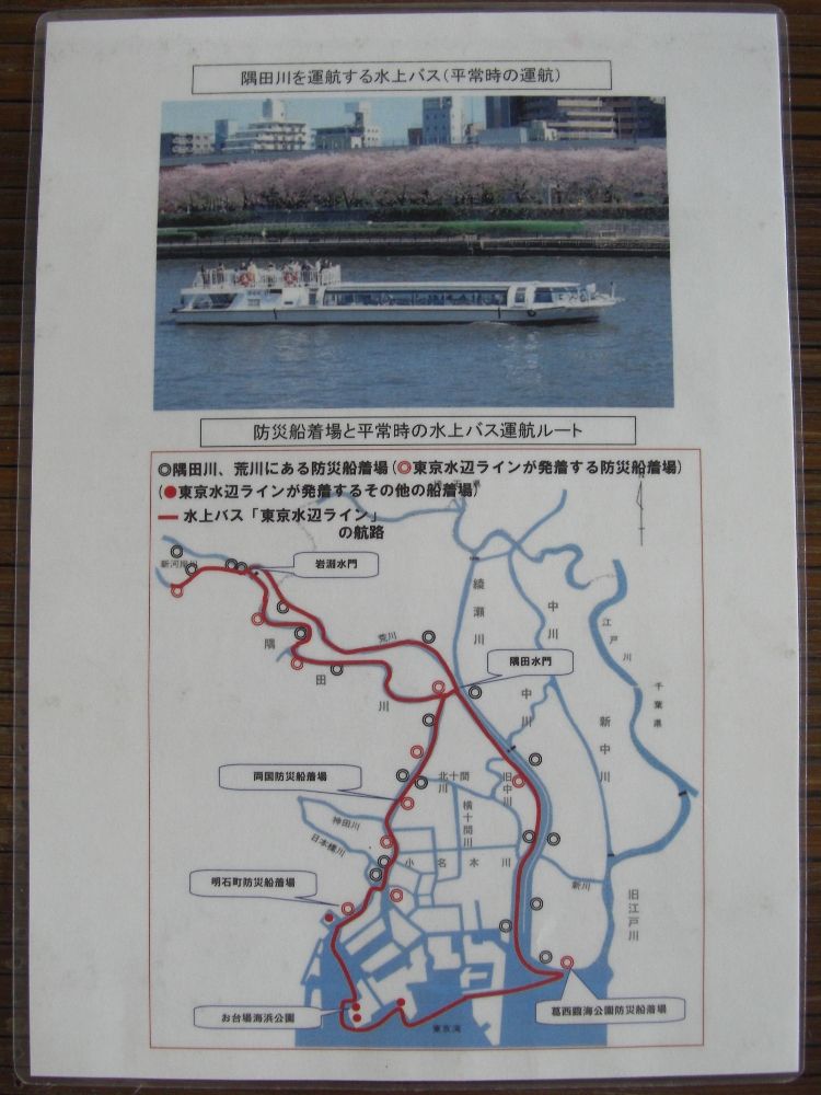 両国乗船場にあった防災船の説明と平常時運航ルート図。