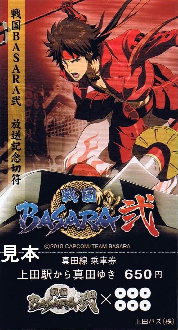CAPCOMから発売されているゲームが派生したTVアニメ第2弾の放送開始を記念して発売された真田幸村デザインの記念切符で上田駅〜真田間の片道乗車券(650円)です。発売場所は上田電鉄別所線上田駅、上田市観光会館、上田バス事務所。私は平成23年8月14日に別所線上田駅で入手しました。【関連記事】