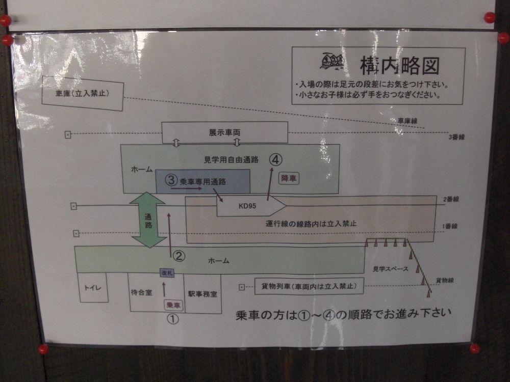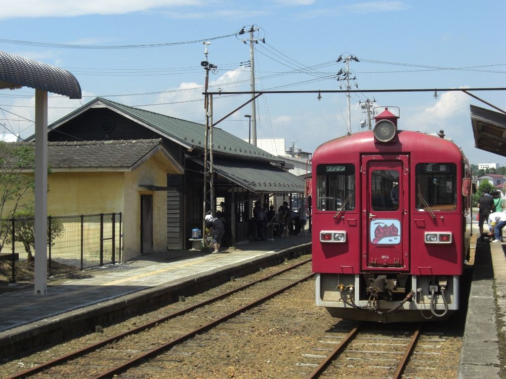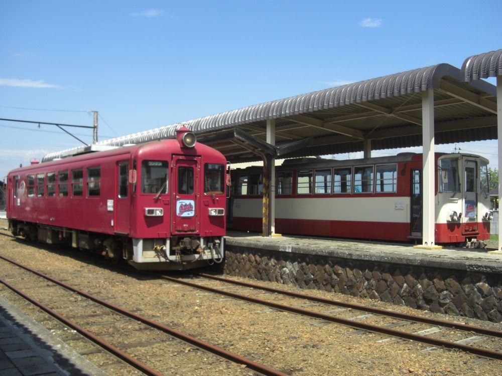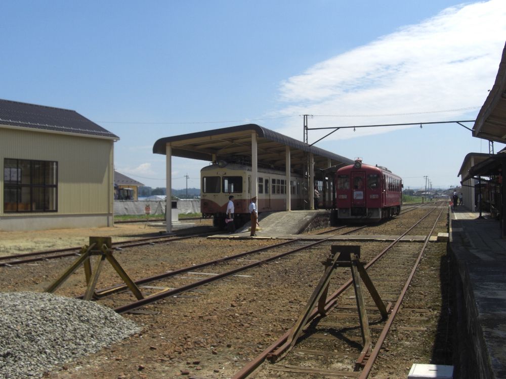 旧若柳駅に停車中のKD95形。くりでん乗車会では島式ホームから乗車します。