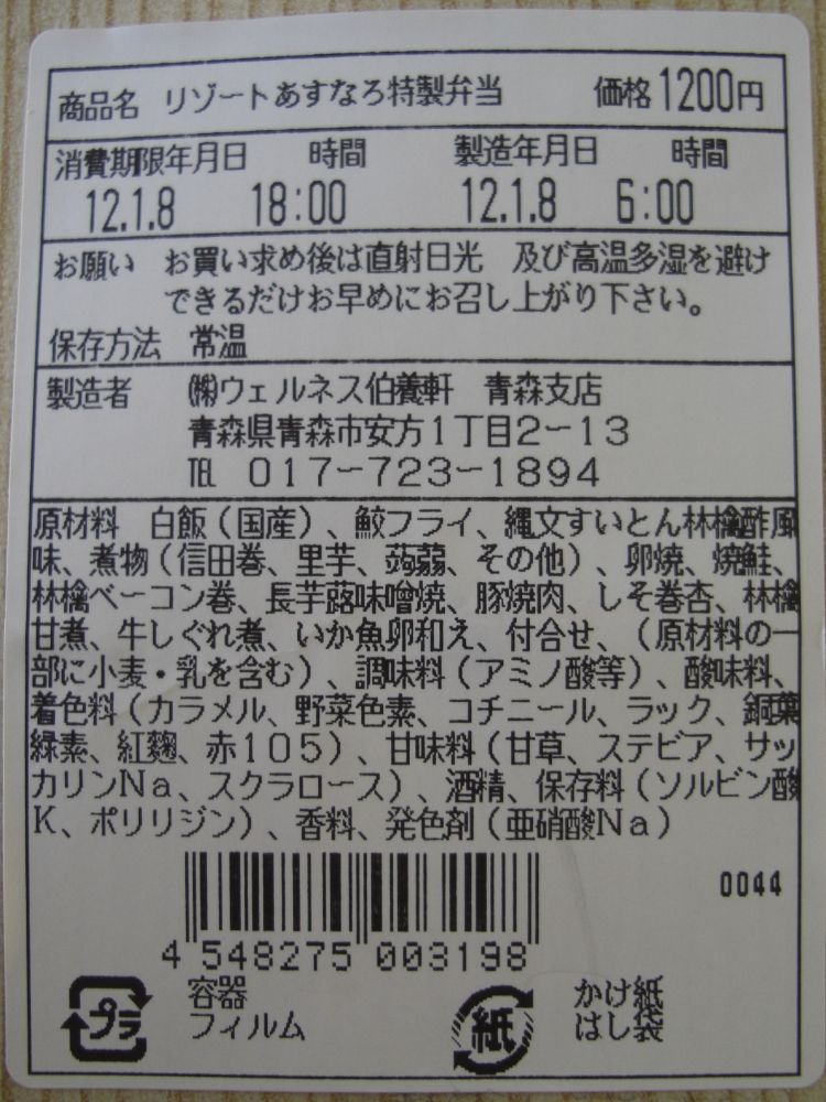東北新幹線新青森開業1周年を記念して青森県内のJR駅を中心に6種類の記念弁当が発売されました。その中で唯一、駅売りされていないのがこの弁当です。JR東日本盛岡支社のプレス発表記事内には『要予約』との記載もあります。なお、平成24年1月7〜9日に東京駅旨囲門で開催されている東京駅新春駅弁大会では、この弁当を含む全6種類の東北新幹線新青森開業1周年記念弁当が購入できます。写真左は掛紙表面。写真右の掛紙裏面は車内見取図とお品書きになっています。