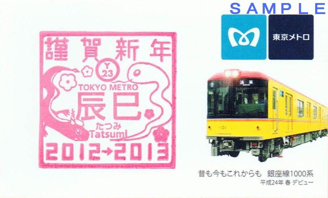 辰巳駅に設置された干支記念スタンプ用台紙です。辰巳駅改札口で希望者に配布。スタンプは改札外の記念撮影ボード横に設置されていました。有楽町線の駅の記念スタンプですが台紙には銀座線1000系車両がデザインされていました。