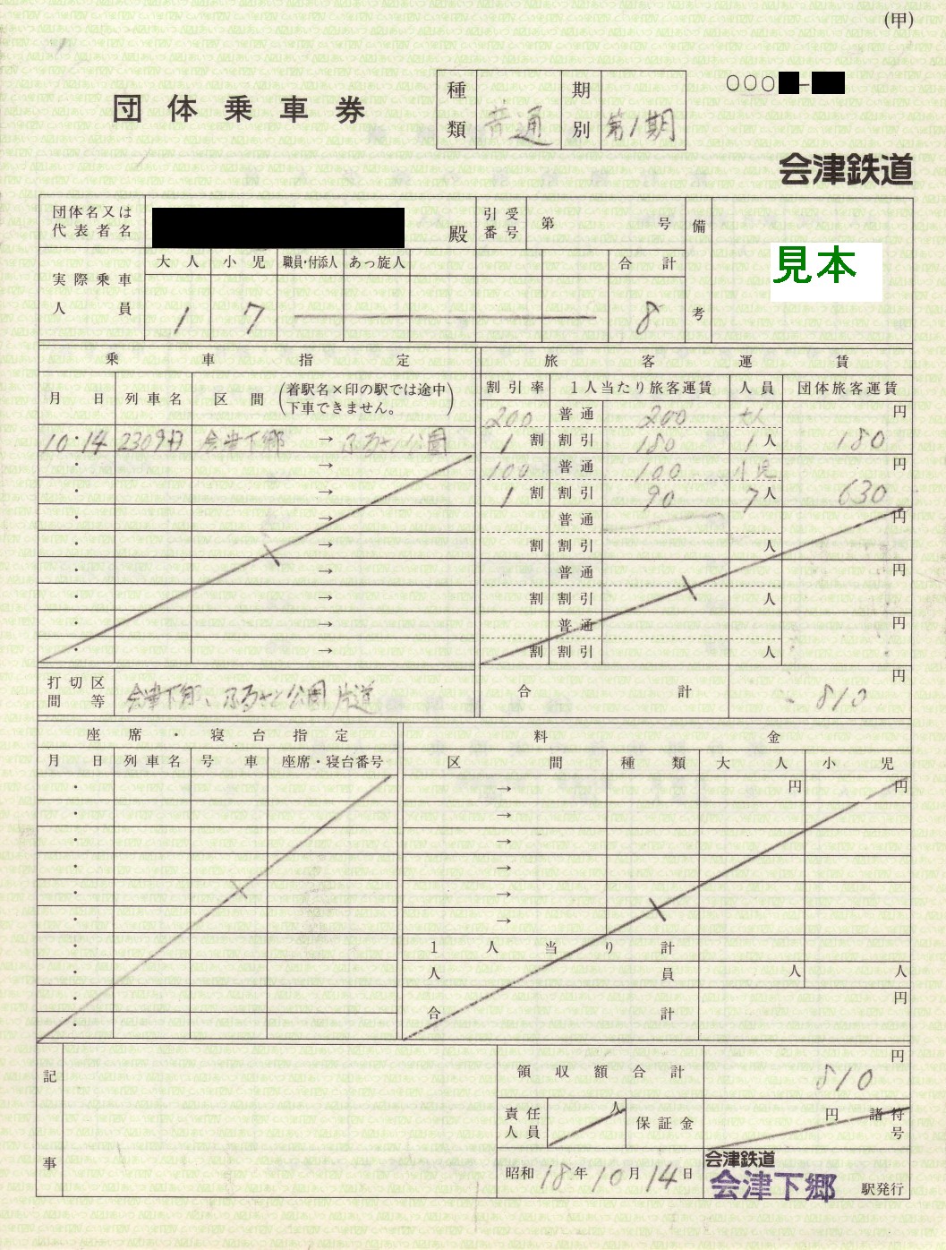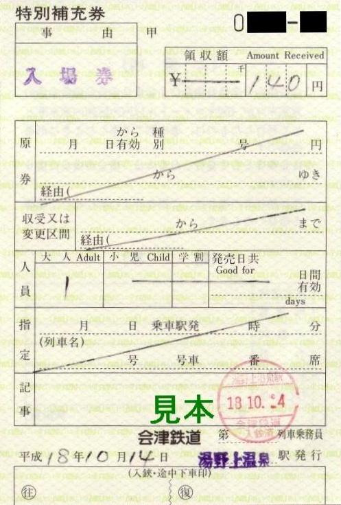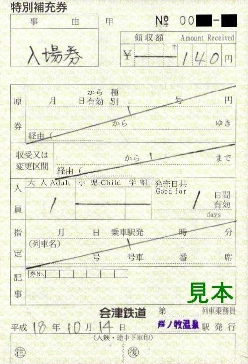 有人6駅とAIZUマウントエクスプレス号車内で入手。どの券も会津高原尾瀬口駅名改称後の新券なので違いはなし。駅売りのものは発行駅名欄にゴム印。車内売りのものは特にゴム印は無い。(車内で車掌がこの特補を持ち合わせているのは今回初めて見ました。今までだとハンディターミナルしか持ち合わせていなかったのですが、たまたまでしょうか?)《回数乗車券、団体乗車券(平成18年10月14日収集)》