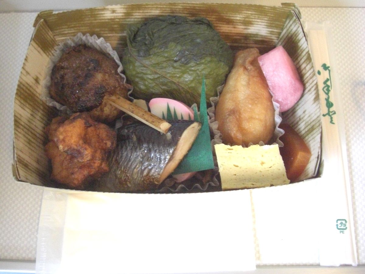 中身です。福島の郷土料理をコンパクトにまとめています。しんごろうは米にじゅうねん味噌を塗り焼いたもので甘い味付け。にしんの山椒漬けは土産物として販売されている濃い味付・色をしたものではなく、あっさりとした味付けで仕上げられています。