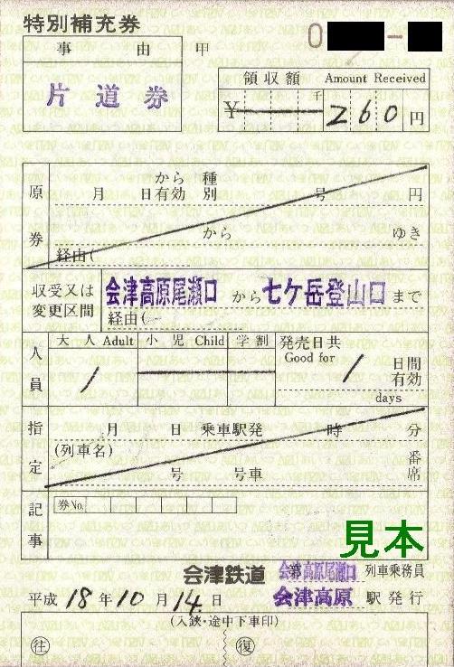 有人6駅とAIZUマウントエクスプレス号車内で入手。どの券も会津高原尾瀬口駅名改称後の新券なので違いはなし。駅売りのものは発行駅名欄にゴム印。車内売りのものは特にゴム印は無い。(車内で車掌がこの特補を持ち合わせているのは今回初めて見ました。今までだとハンディターミナルしか持ち合わせていなかったのですが、たまたまでしょうか?)