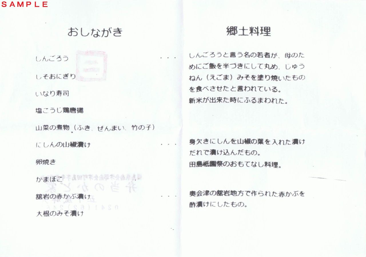 中身です。福島の郷土料理をコンパクトにまとめています。しんごろうは米にじゅうねん味噌を塗り焼いたもので甘い味付け。にしんの山椒漬けは土産物として販売されている濃い味付・色をしたものではなく、あっさりとした味付けで仕上げられています。======================================