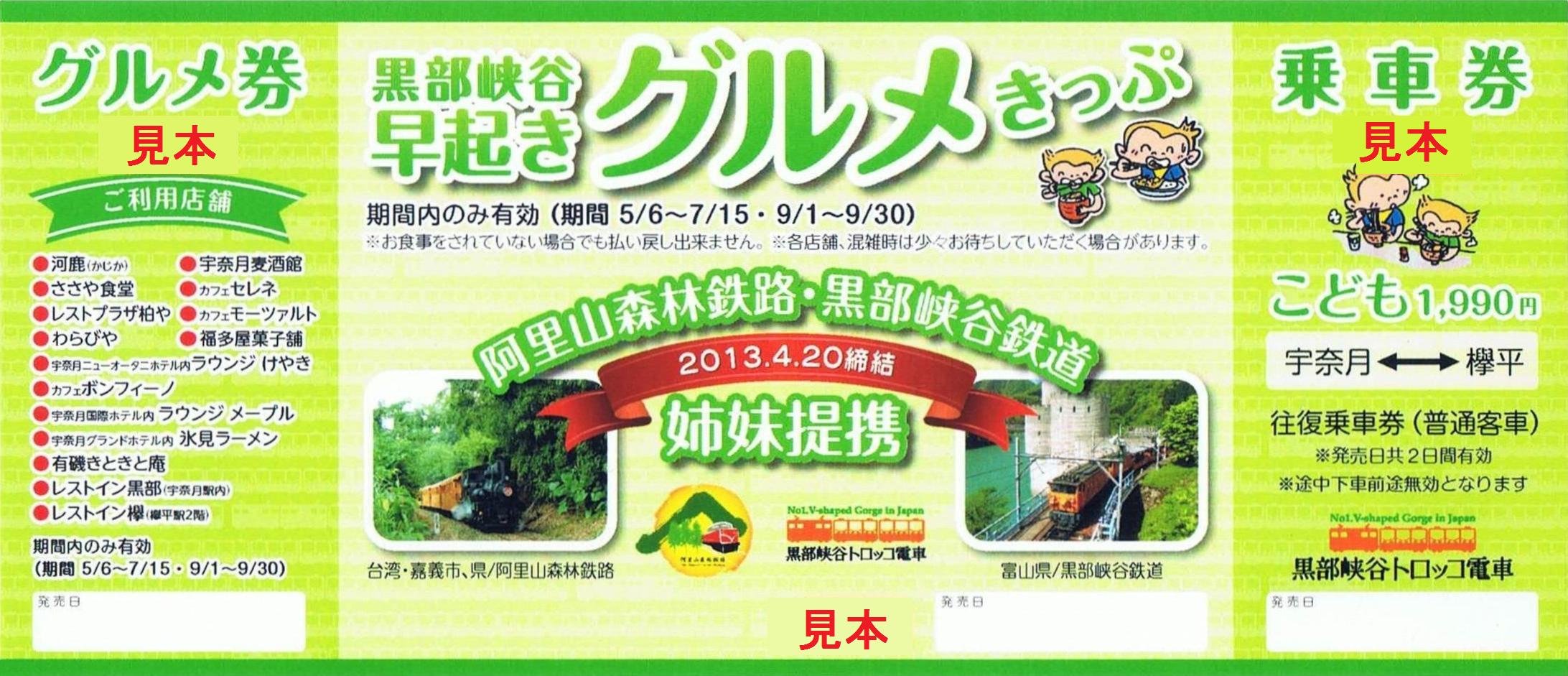 黒部峡谷鉄道側が発行した記念乗車券です。行きは宇奈月駅を早い時間帯に発車する列車のみ使用可能。宇奈月駅〜欅平駅の普通客車利用の往復乗車券と券に記載された宇奈月駅周辺の飲食店(15店舗)で利用可能なグルメ券がセットになっています。券面全体に客車の地紋が使用。こども用(写真左)は黄緑色、おとな用(写真右)は黄色です。両鉄道の写真が使用されており、阿里山森林鉄道の写真は観光列車として運転されているシェイ式蒸気機関車+木造客車のものです。