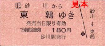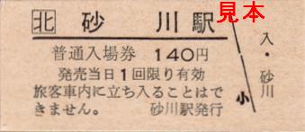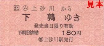 先述の入場券セット・乗車券セットが普通の(記念切符らしくない)様式なのに対し、このA型硬券往復乗車券は単品発売・台紙無しで『思い出の上砂川支線』の影文字入りでした。