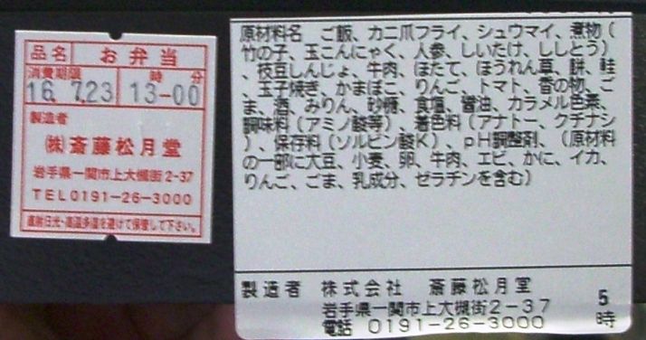 一ノ関駅の駅弁業者・斎藤松月堂が調製したお弁当で、朝食としてお茶と一緒に配布されました。写真は掛紙。