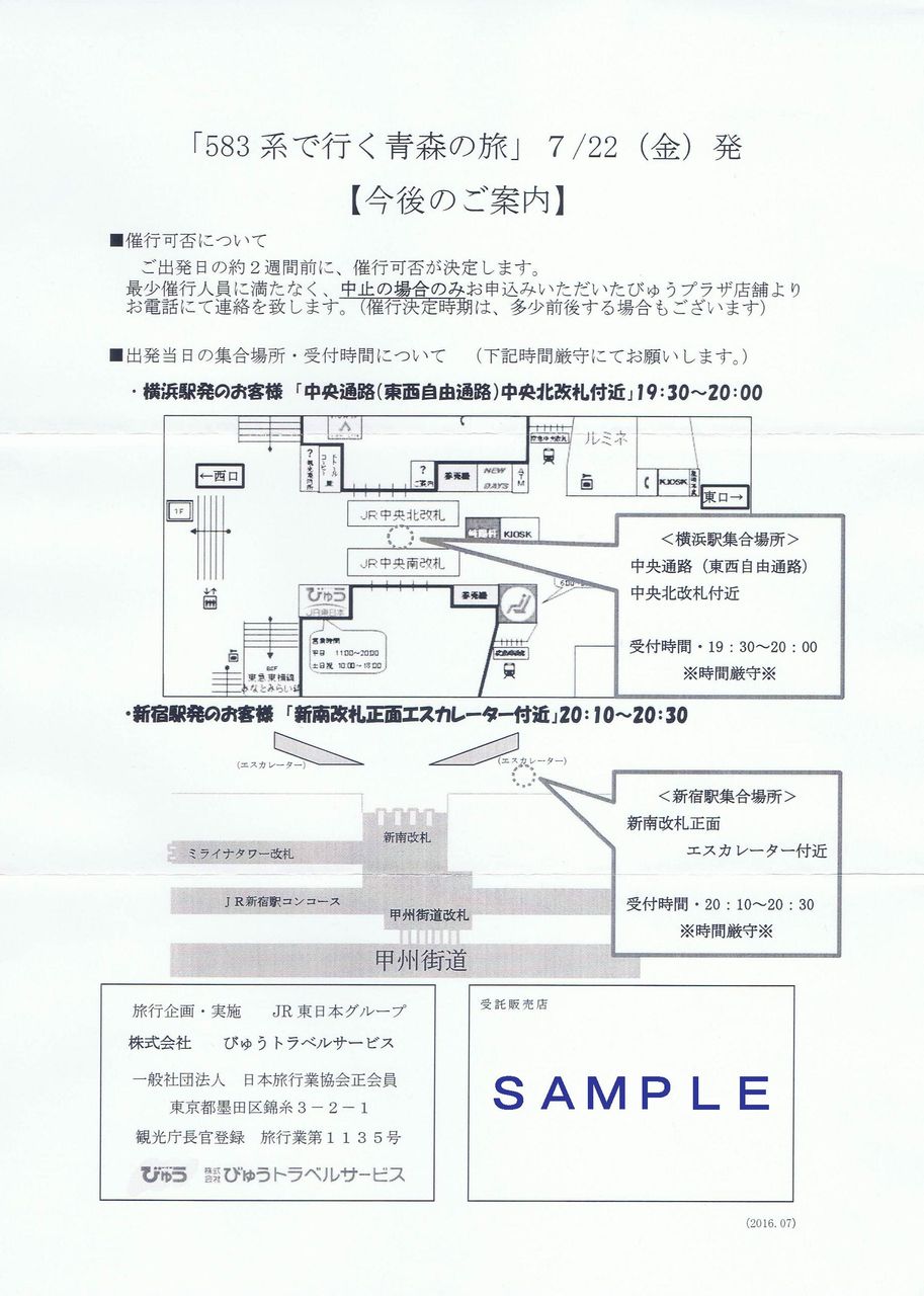 今後のご案内は、乗車駅が横浜、新宿と2箇所に分かれているため、集合場所を説明しています。《乗車駅集合場所(横浜駅)で配布されたもの》