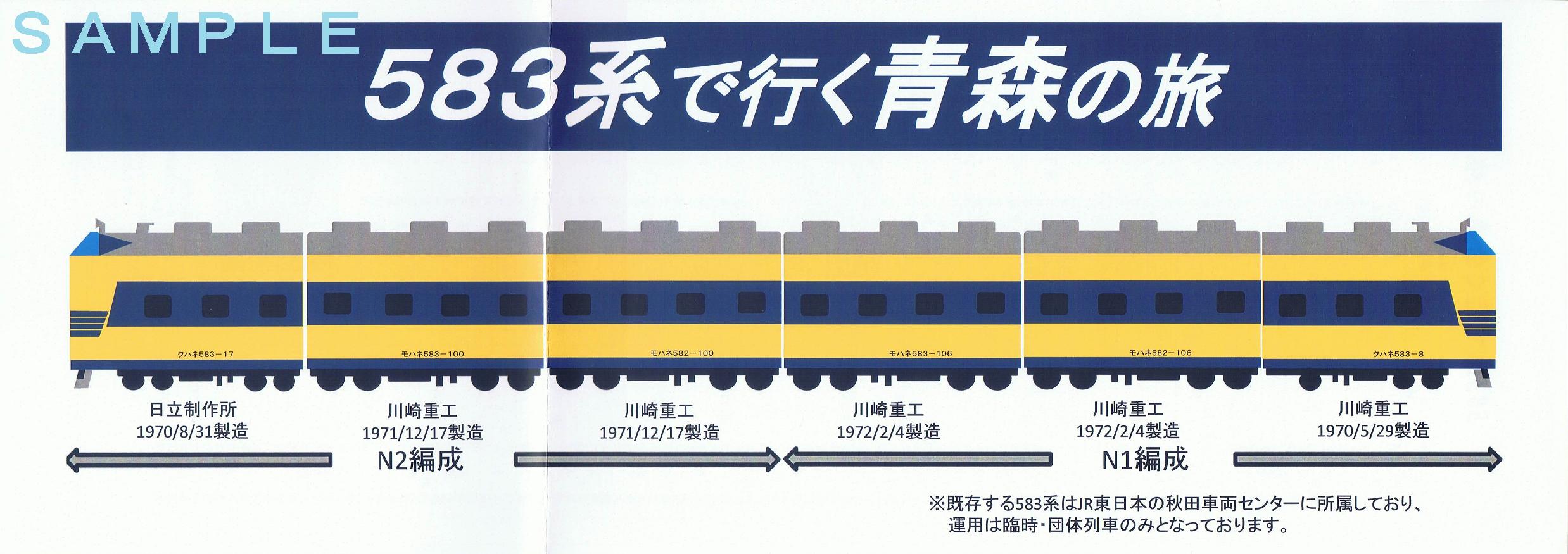 『583系で行く青森の旅、函館の旅』シリーズは、青森県・函館デスティネーションキャンペーン(青函DC)にあわせて発売され、羽越・奥羽本線経由、更に羽越・奥羽本線経由+北海道新幹線も設定されていました。また、同キャンペーン関連の『上野発の夜行列車で行く 青森・函館の旅』(旅行商品。東北本線・いわて銀河鉄道線・青い森鉄道線)、『特急583系青函DC号』(臨時列車。奥羽本線・羽越本線青森〜酒田または奥羽本線青森〜湯沢)にも583系が使用されました。この他に今年は大阪(JR西日本)や長野(しなの鉄道、えちごトキめき鉄道)方面の旅行商品で583系による他社乗り入れが行われました。