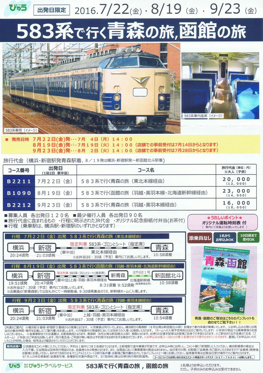 JR東日本横浜支社では、2016年7月〜9月に出発する旅行商品『583系で行く青森の旅、函館の旅』を発売しました。そのうち、2016年7月22日出発分については『583系で行く青森の旅(東北線経由)』(JR東日本横浜支社リリースでの旅行商品名。本記事掲載のリーフレットには『583系で行く青森の旅(東北本線経由)』と記載)として発売され、東海道本線の横浜駅を起点に、山手線、東北本線、盛岡から先はIGRいわて銀河鉄道(いわて銀河鉄道線盛岡駅→目時駅)、青い森鉄道(青い森鉄道線目時駅→青森駅)に乗り入れて運転されました。