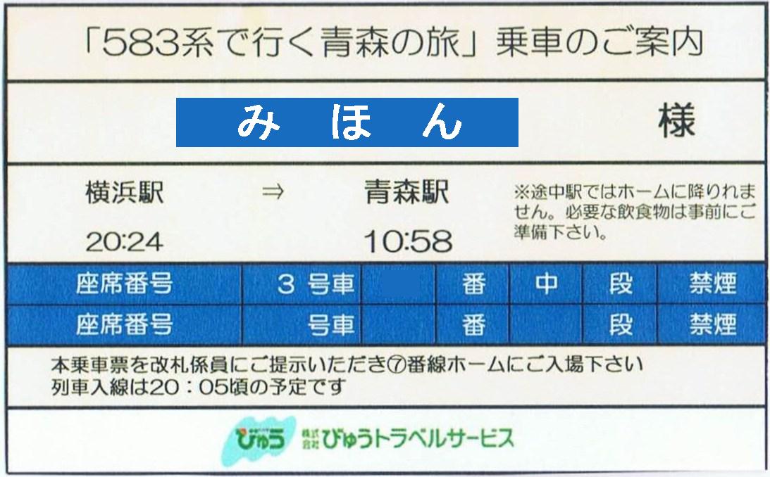 びゅうトラベルサービス発行。この旅行においては乗車券・指定席券の役割を果たしました。私は3号車の中段に乗車。中段は寝てしまえば関係ないですが、目が覚めている時は窮屈に感じます。
