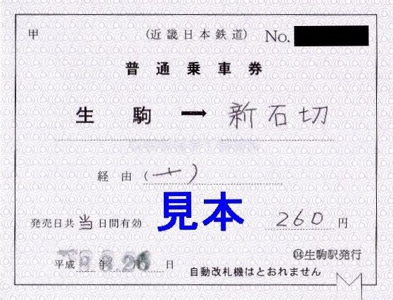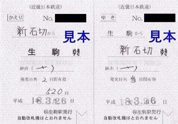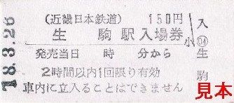 硬券入場券の記載事項は各駅とも同じですが、新石切駅のものだけ表面の数字と裏面の券番のフォントが他駅と異なっていました。《生駒駅》