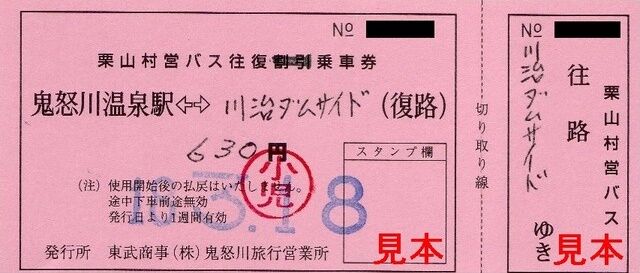 ・栗山村営バス往復乗車券 川治ダムサイド630円(小児最安)
