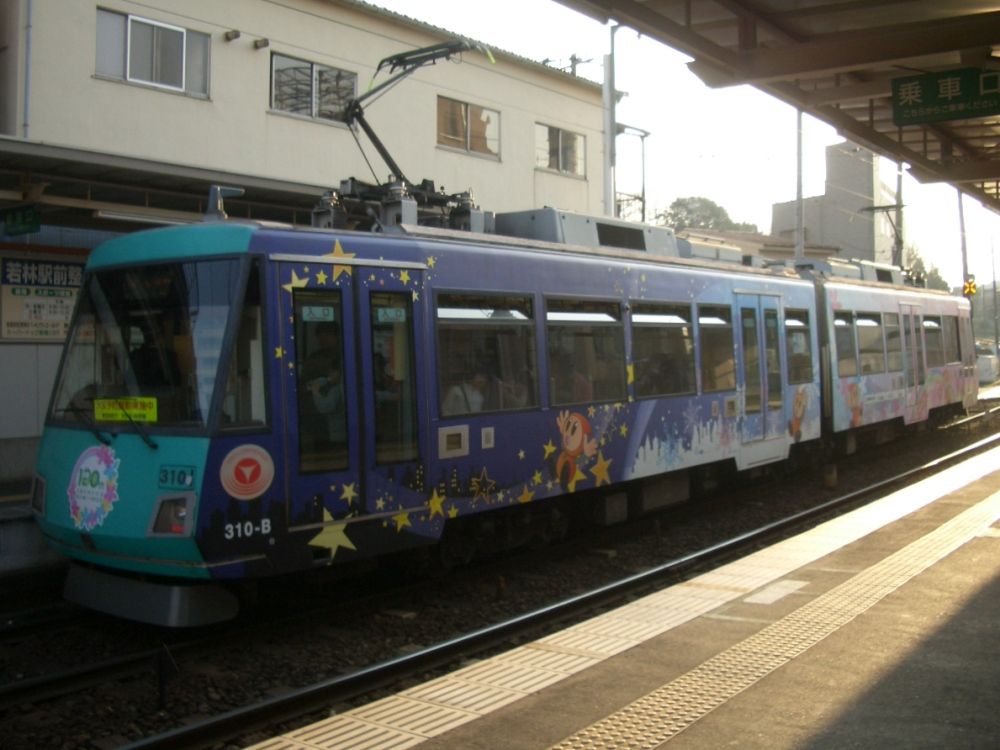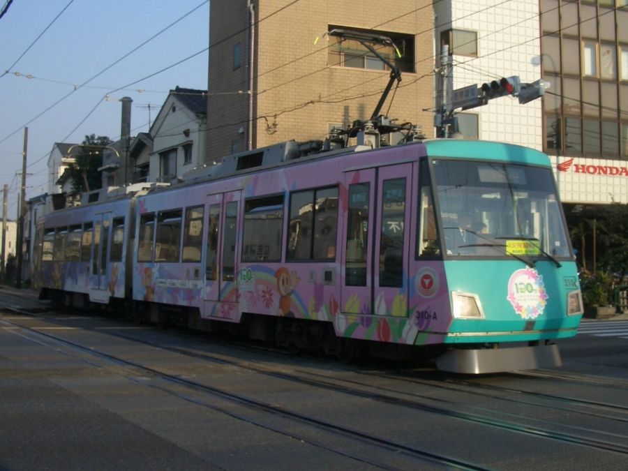 東急世田谷線では通常塗装以外に「玉電200形登場50周年記念塗装」や「玉電開業100周年記念花電車(写真左・右)」といった記念塗装車もあり面白いです。若林にて撮影。花電車は前面にヘッドマークステッカーを付けています。私は見なかったのですが、訪問日前日(平成19年3月3日)に放送されたテレビ東京系『出没!アド街ック天国』で玉電が取り上げられたそうで、沿線にある商店のおばさんによると『今日は随分、人が多いわ。前もあの番組でこのあたりが取り上げられたら翌日凄かったもの。テレビの影響って凄いわよね。』との事。確かに15〜16時頃は世田谷線散策きっぷを持った親子・夫婦・友達同士といった感じの方々多数おり、各駅で10人以上のまとまった乗降が見られ、短区間乗車の影響か客の入れ替わりが随分激しかったと思います。