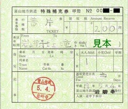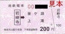 ・軟券入場券(駅名補充式)・軟券乗車券 岩峅寺→釜ヶ淵 上滝 200円
