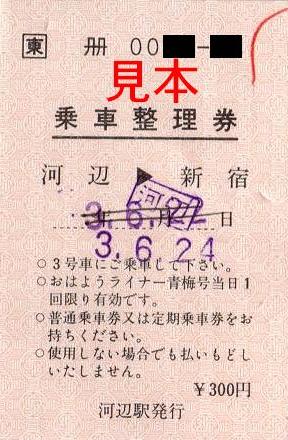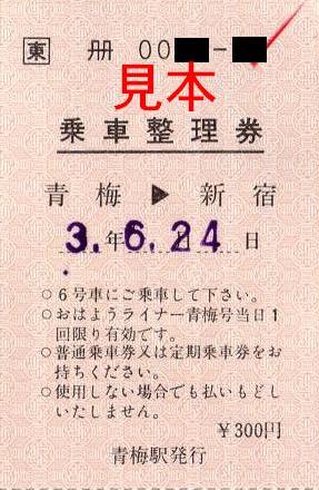 日付は恐らく訪問日翌日のもので、当時は前売りがあったのではないかと思います。当時の列車名は朝の上り方面が『おはようライナー青梅号』、夜の下り方面が『ホームライナー青梅』で、現在は『青梅ライナー』に改称されています。当時の料金は300円。