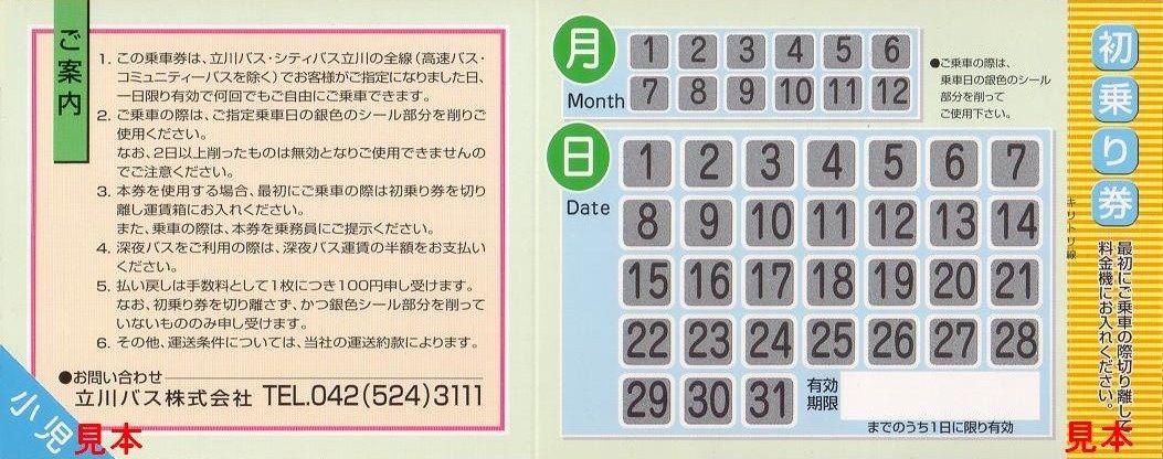 高速バス・コミュニティバスを除く立川バス全路線で有効の1日フリー乗車券。大人700円。小児は断片を切って350円で販売。