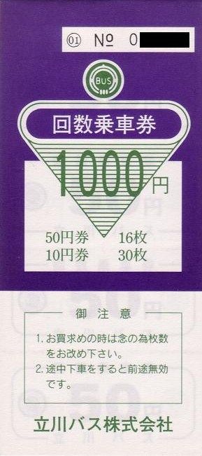 立川バスホームページの各種乗車券に掲載されていませんが、売価1000円(50円券×16枚+10円券×30枚)の紙製の回数乗車券があります。売価1000円で組み合わせの違うものもあるかも知れません。バス車内ではほとんどバスカードの販売だけのようです。【関連記事】